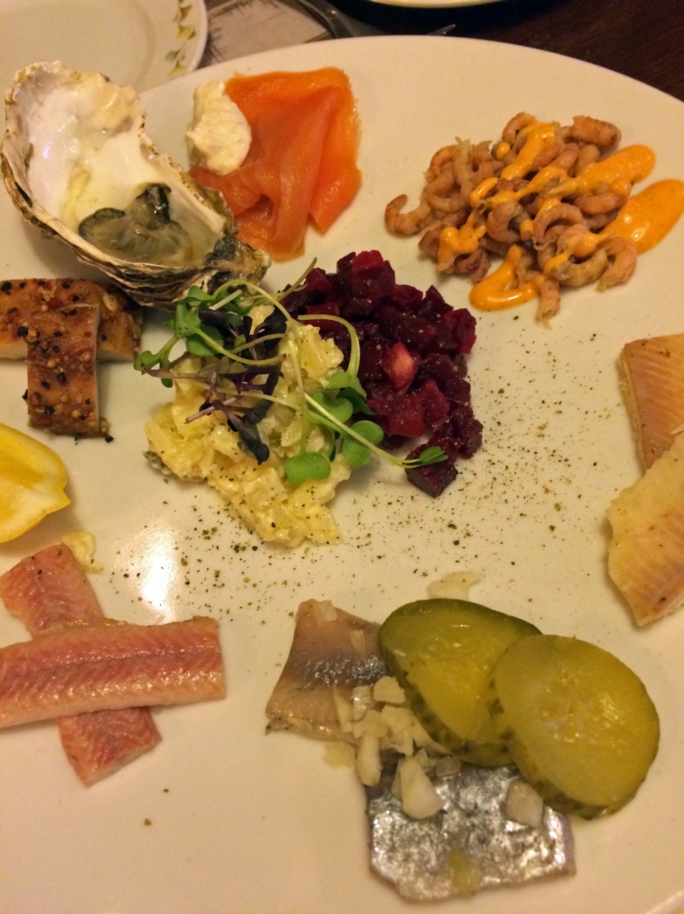 牡蠣、スモークサーモン、小エビ、酢漬けニシン、燻製ウナギ、燻製鯖等 ウナギを食べることに驚きました
