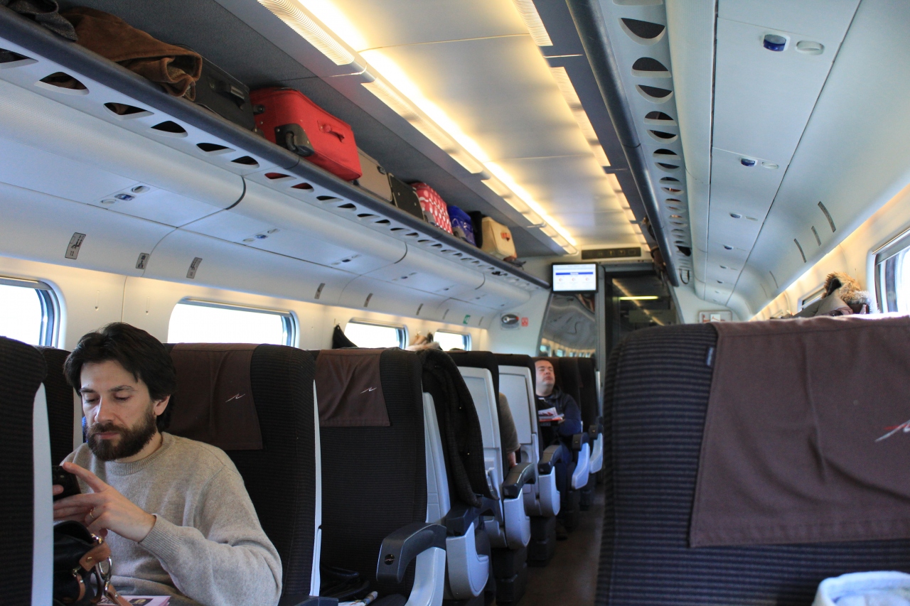 座席はヨーロッパの鉄道で一般的な中央に向かって両端から固定された席が並ぶ仕様です。