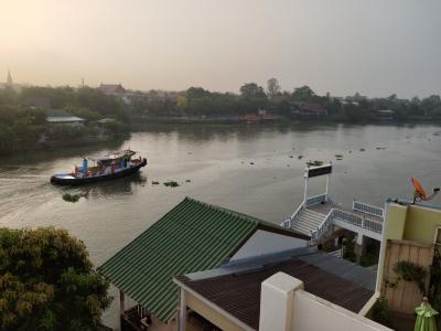 ゲストハウスのベランダからチャオプラヤー川を行きかう船を眺めていると時...