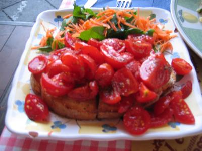 写真は、ブルスケッタです。ガーリックバターが十分しみたトーストに山盛りのトマトとルッコラでとっても美味しい(^-^)\\\\