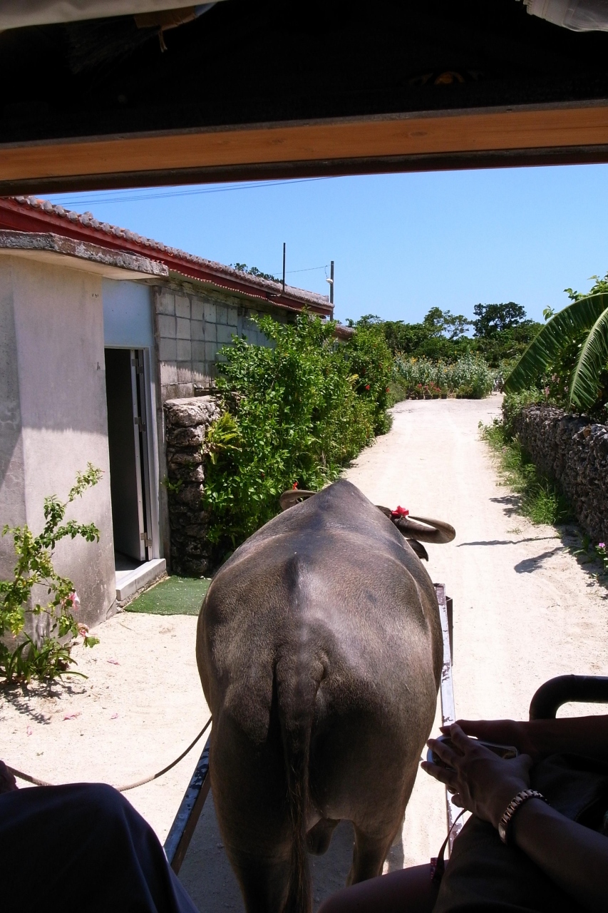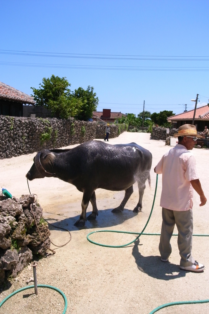 おじいが水牛を引っ張って赤瓦の街並みを案内してくれます。風情があってとても素敵です。途中で水牛がばててきたら、民家から水道を借りてシャワーをかけてあげていました。自由な感じがまたいい・・・。