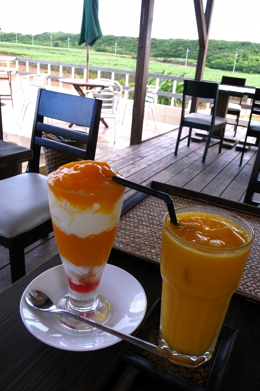 サトウキビ畑にお水がまかれていて、虹が出ているような絶景の中でマンゴーパフェとマンゴージュースをいただきました。