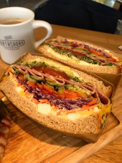 サンドイッチのアップ。ぎっしり詰まっています…!新鮮でヘルシーな野菜や...