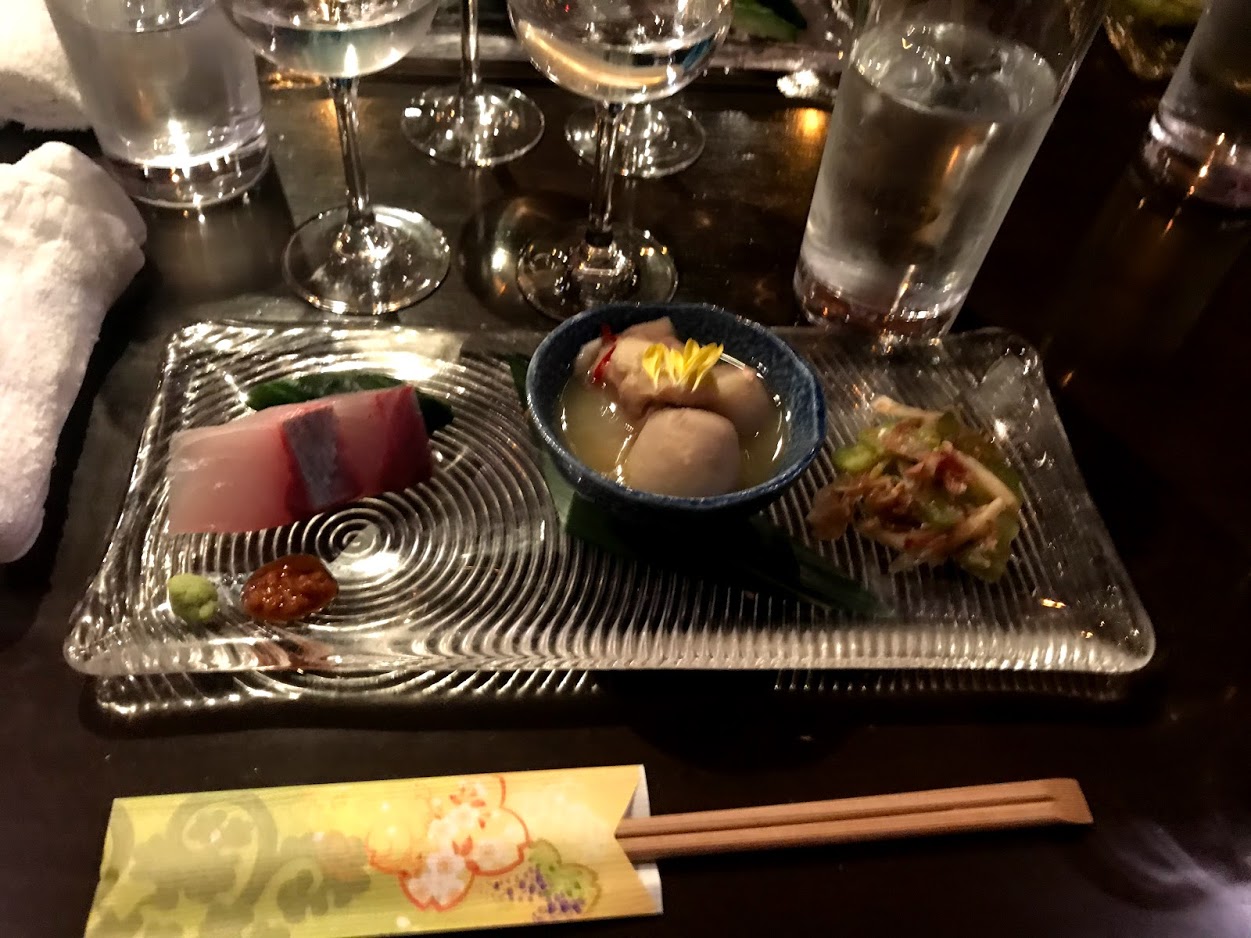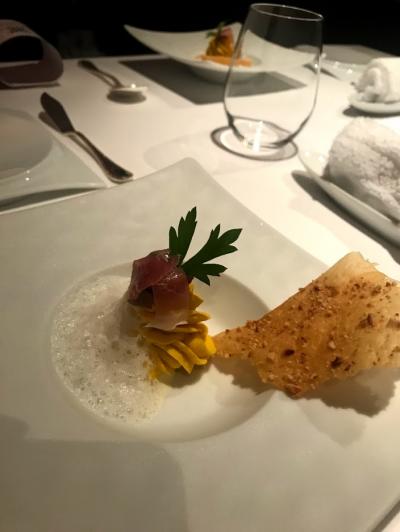 アペタイザー、この日はほうれん草のクレープにスモークサーモン、クリームチーズ(だったかな?)のクレープロール。シェフが目の前でカットして提供してくださいました。サーモンの旨味がぎゅっと詰まって濃厚。そこにアクセントとしてチーズのさっぱりとした酸味が口の中をさっぱりとさせてくれます。