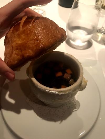 蓋の役割?にもなっているパイは一度取って後で入れて食べるのがおすすめと店員さんがおすすめしてくださったのでその方法で。濃厚なコンソメスープにパイ生地がとても合う!