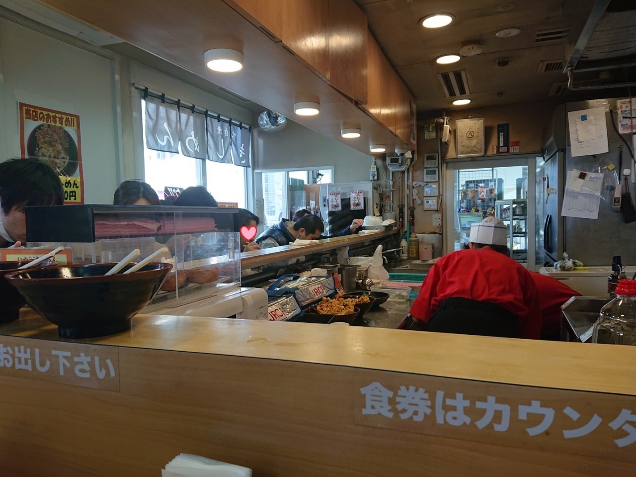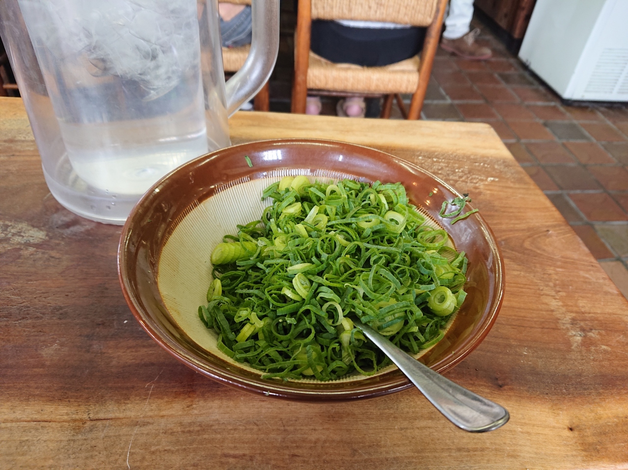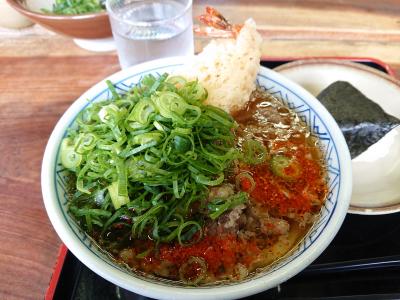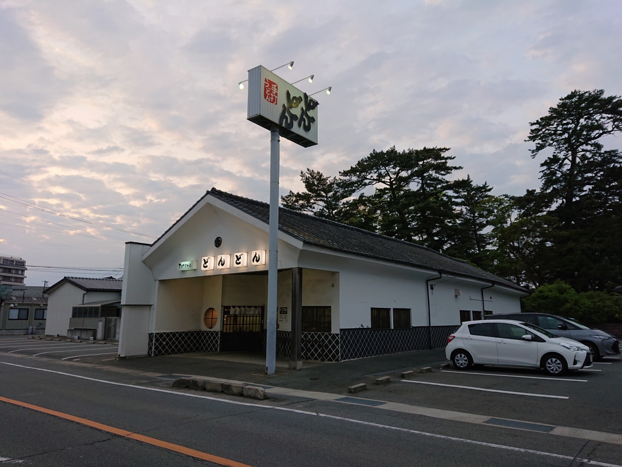 東萩駅からは歩いて行ける距離。お昼時ということで、店内は激しく混雑していました。駐車場も戦場と化しておりますね。店内に入り、まず最初に中央のレジで注文&お会計。その場でプラスチックの札(食券)をもらいます。その後、席に着いて着丼を待つわけですが…先に席を取っておいた方が良いでしょうね。お昼は超混むので相席は必須のようです。食べたのは「肉天うどん550円」「のりむすび100円/個」