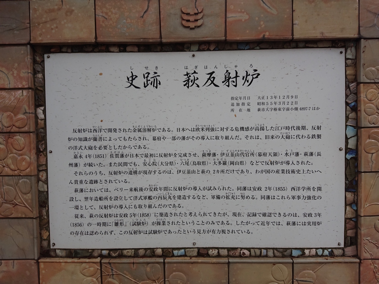 東光寺から自転車(電動)でせっせと行きました。市街地からはちょっと離れているので、車での移動か、せめて電動自転車が良いでしょう。無料駐車場があって見学時間も15分ほどと、さほどかからないと思います。駐車場からは少し階段を上がって行くので足の悪い方は難しいでしょう。国内の反射炉は伊豆の韮山と、ここ萩しか残ってないそうで、貴重な世界遺産。折角萩まで来たら是非訪れてほしいスポットです。無料で見られますし、17時までならボランティアの方が説明もしてくれます(要現地での申込み)。