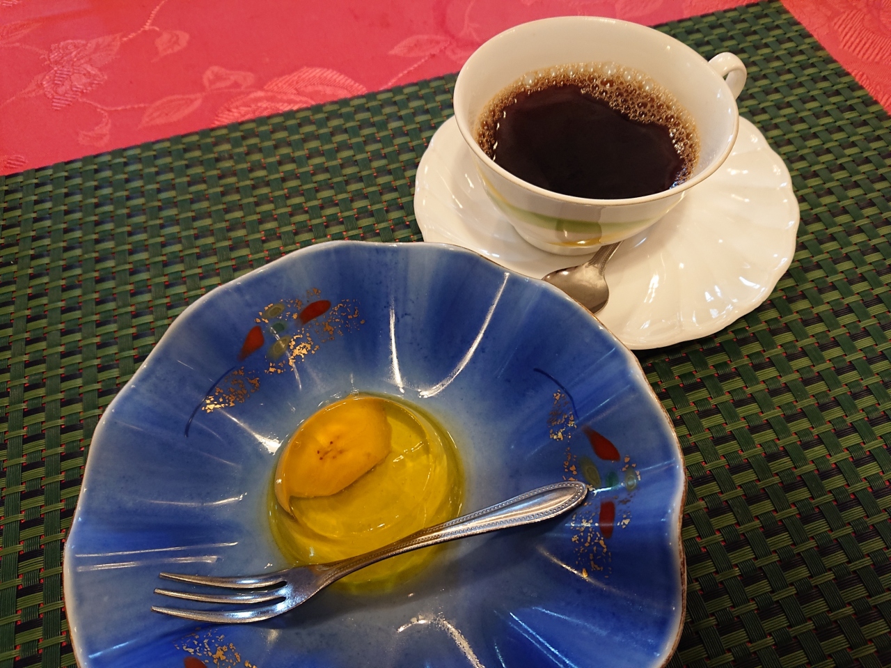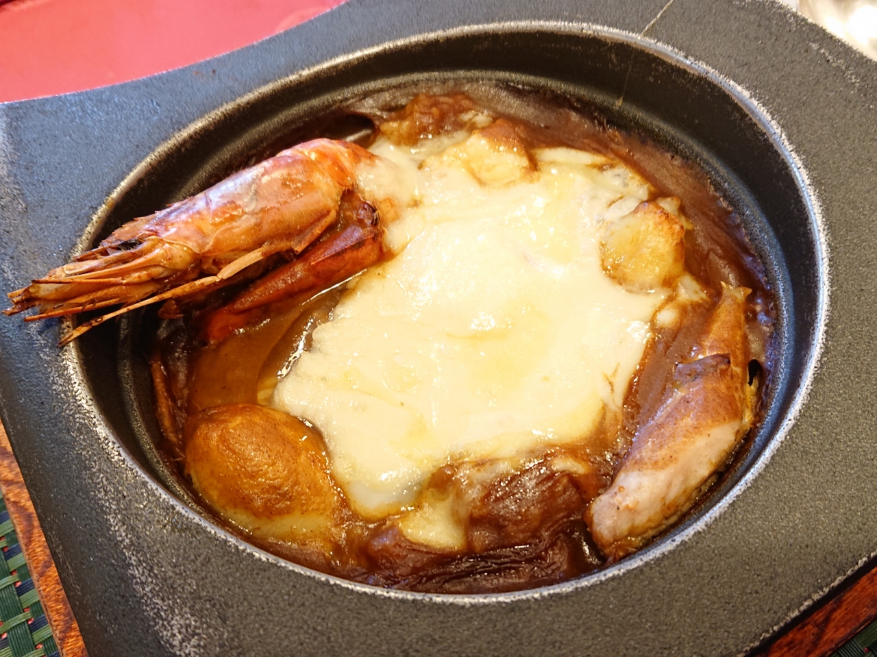 焼きカレーが名物のこちらも有力候補の一つ。警戒して少し早い時間のランチタイムで訪問ですが大型連休ということもあってか激しく混雑。お一人様と告げ、なんとかギリギリ座れました。抱いたのは『焼きカレーセット1490円』『瓶ビール530円』焼きカレーにはスープ、サラダ、漬物デザート(バナナゼリー)とコーヒーがつきます。瓦という特徴的な容器に入った門司港名物、焼きカレー。場所柄もあって小フグが丸ごとin。海老やイカなどの海鮮がたっぷり入ってますがそうです、門司港はその昔バナナの輸入拠点であり、