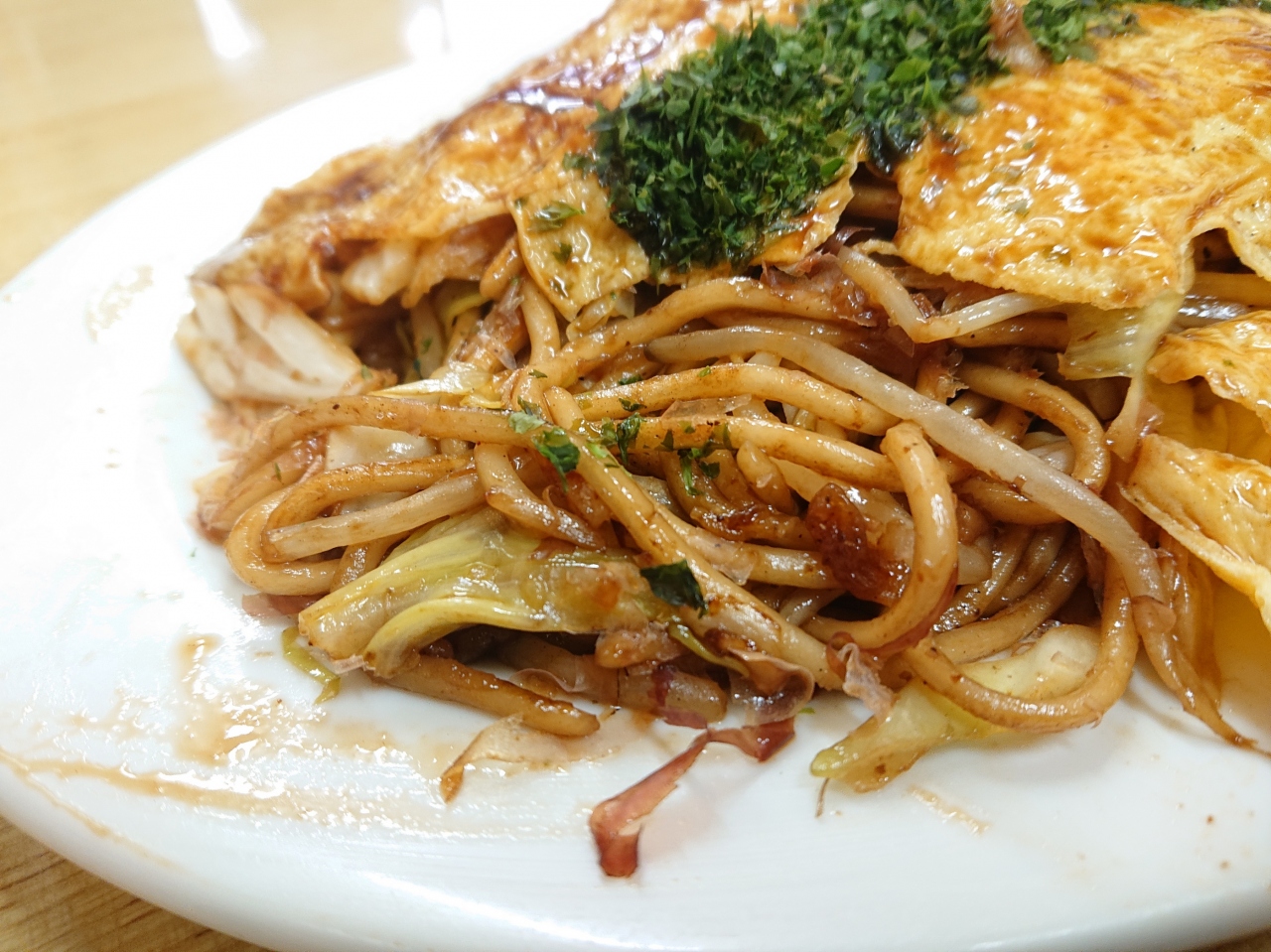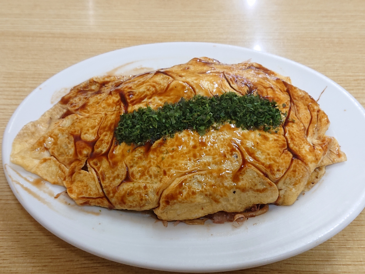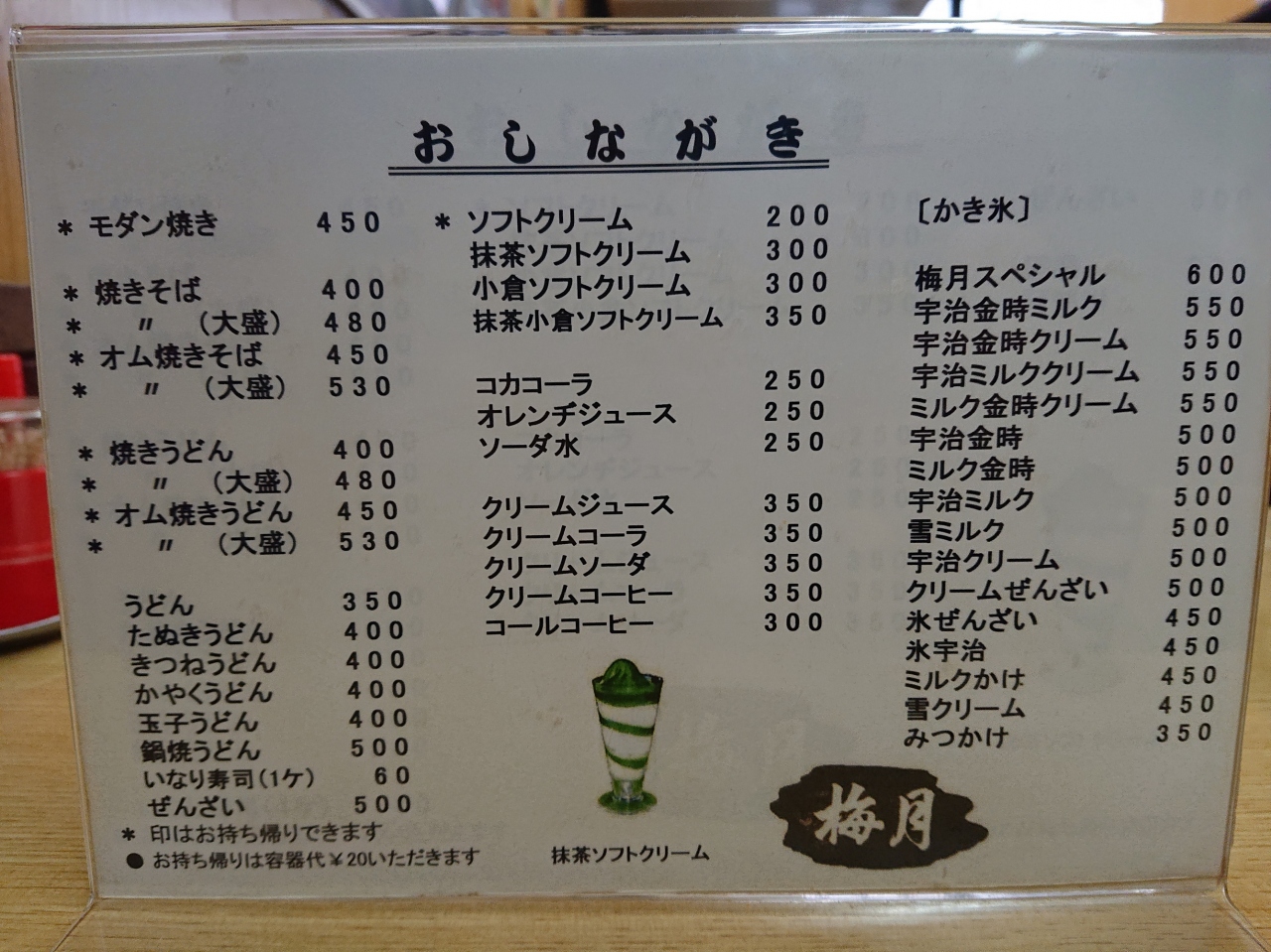 こちらのお店の一番のオシは本格生抹茶を使ったコスパの高い抹茶ソフト(300円)なんですが…お腹との相談で断念しました。もう一つ心に決めていた『オム焼きそば450円』を頂くことに。懐かしいお味の焼きそばと、ふわふわオム玉の上にタップリのソース。この450円はステキ過ぎです。他のメニューも全般に超安い。