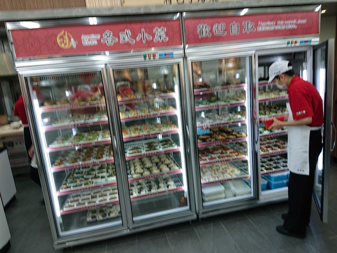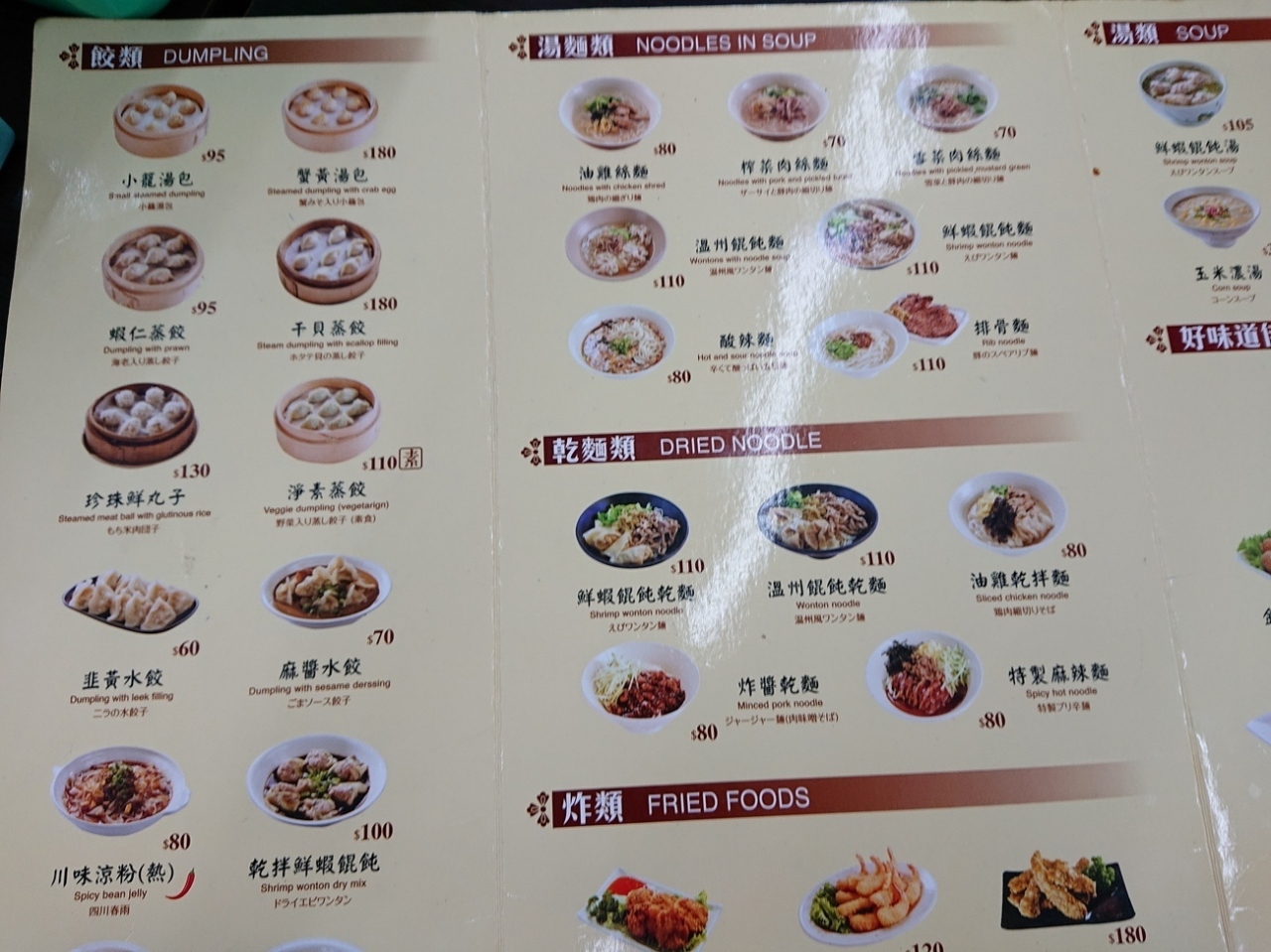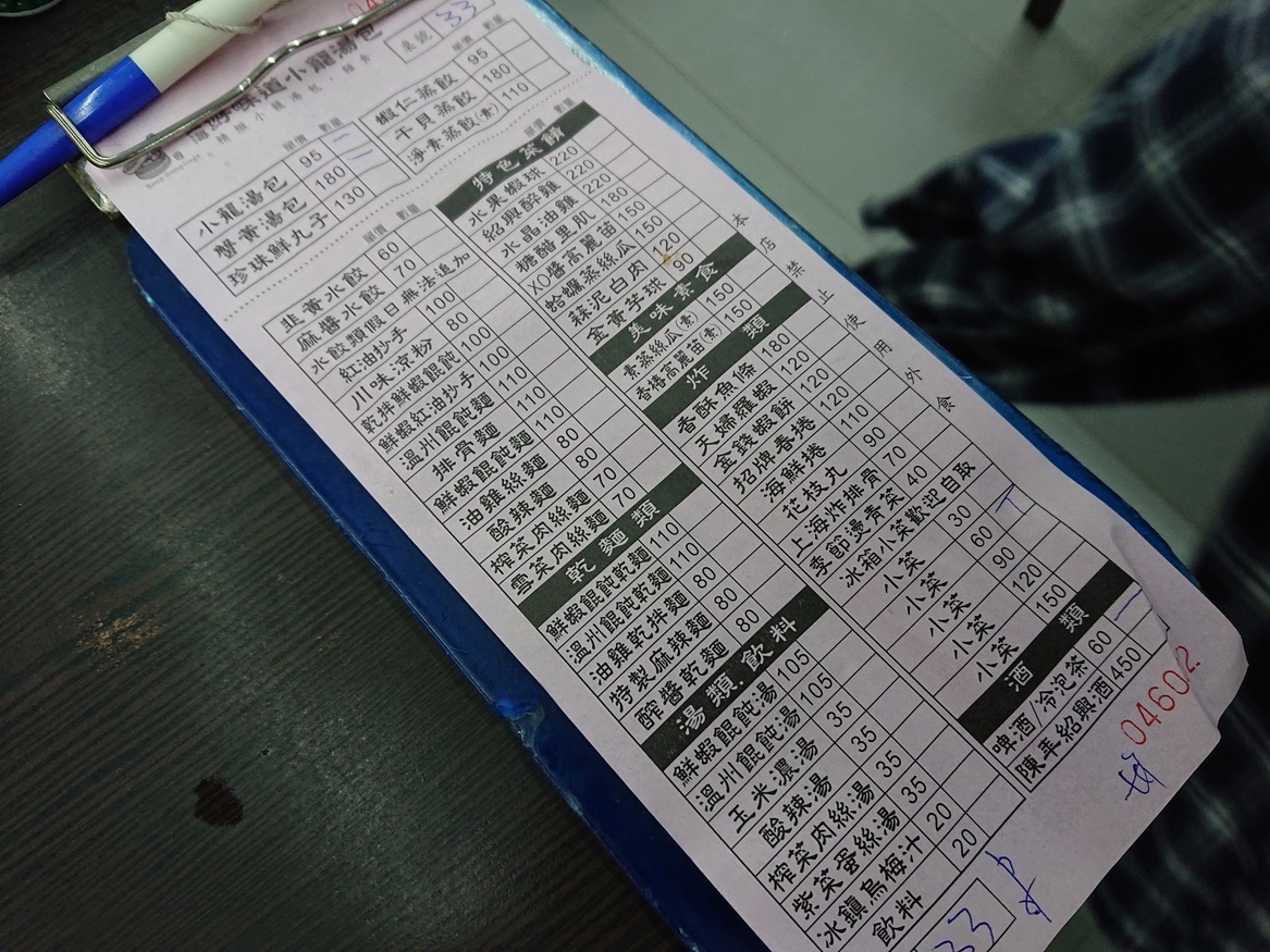 頂いたのは小籠湯包(95元)蟹味噌小龍湯包(180元)小皿2皿(60元/皿)台湾ビール。自由にどうぞ、の陳列ケースには沢山の小皿料理が並んでましてそれぞれにお値段はバラバラ。店員さんがテーブルを見て、卓上のレシートに小皿を何皿食べたか書いていきます。