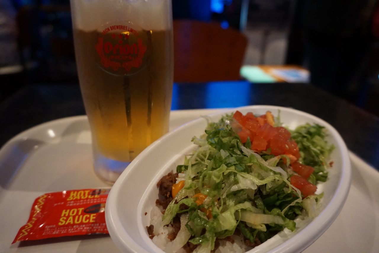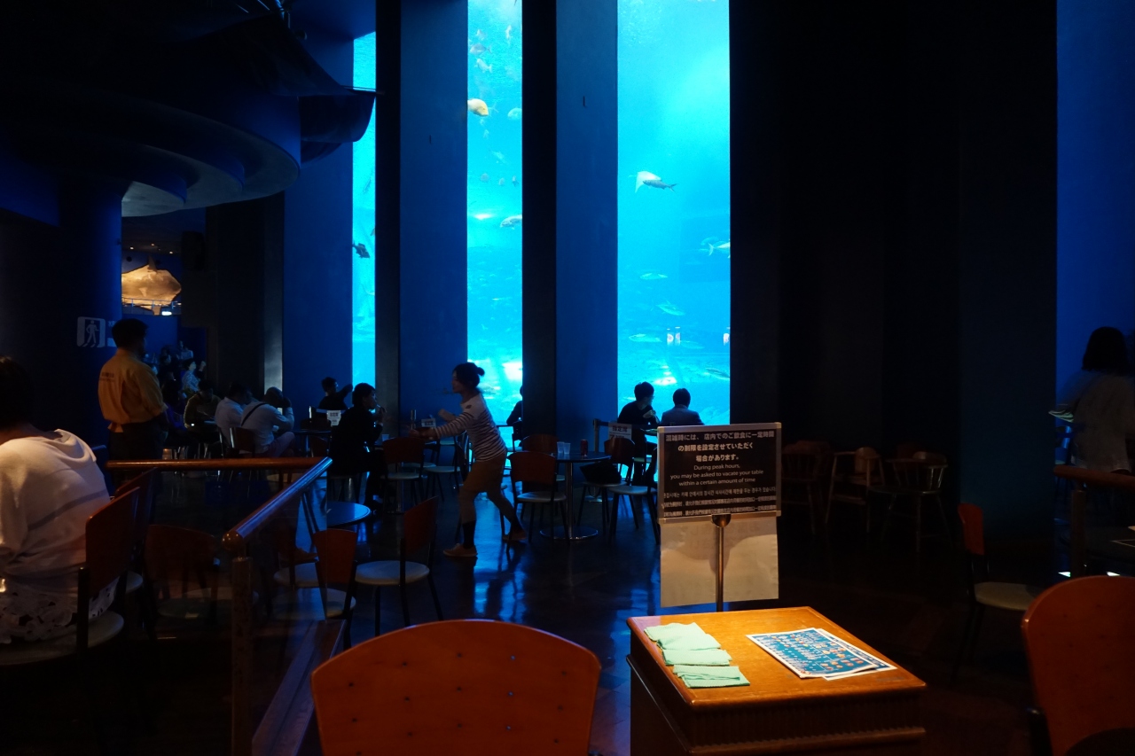 お料理は限られるし、お味も軽~い感じ(手が込んでないの丸わかり)。けどけど、兎に角雰囲気ですね。目の前にドデカいジンベイザメが悠々と泳ぐのを見ながら頂くお食事…これは何とも言えない幸せです。頂いたのはオリオンビール生(565円)タコライス(617円)前述したように、お料理は全く手は込んでません。まぁでも、ここでしか味わえない雰囲気で頂くわけなので、それなりに美味しく感じちゃうのは不思議^^;