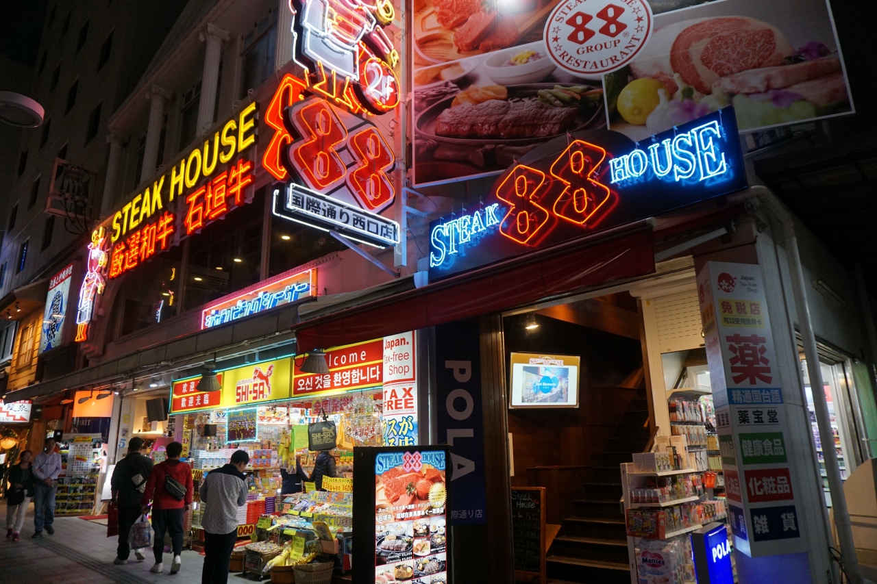 国際通りには沢山のステーキ屋さんが軒を連ねていますね。こちらのお店は県内には数店舗を有し、有名なお店のようです。ベストポジションの窓際席に案内されて頂いたのは、テンダーロインステーキ(200g)(2,500円・税別)オリオンビール生(600円・税別)