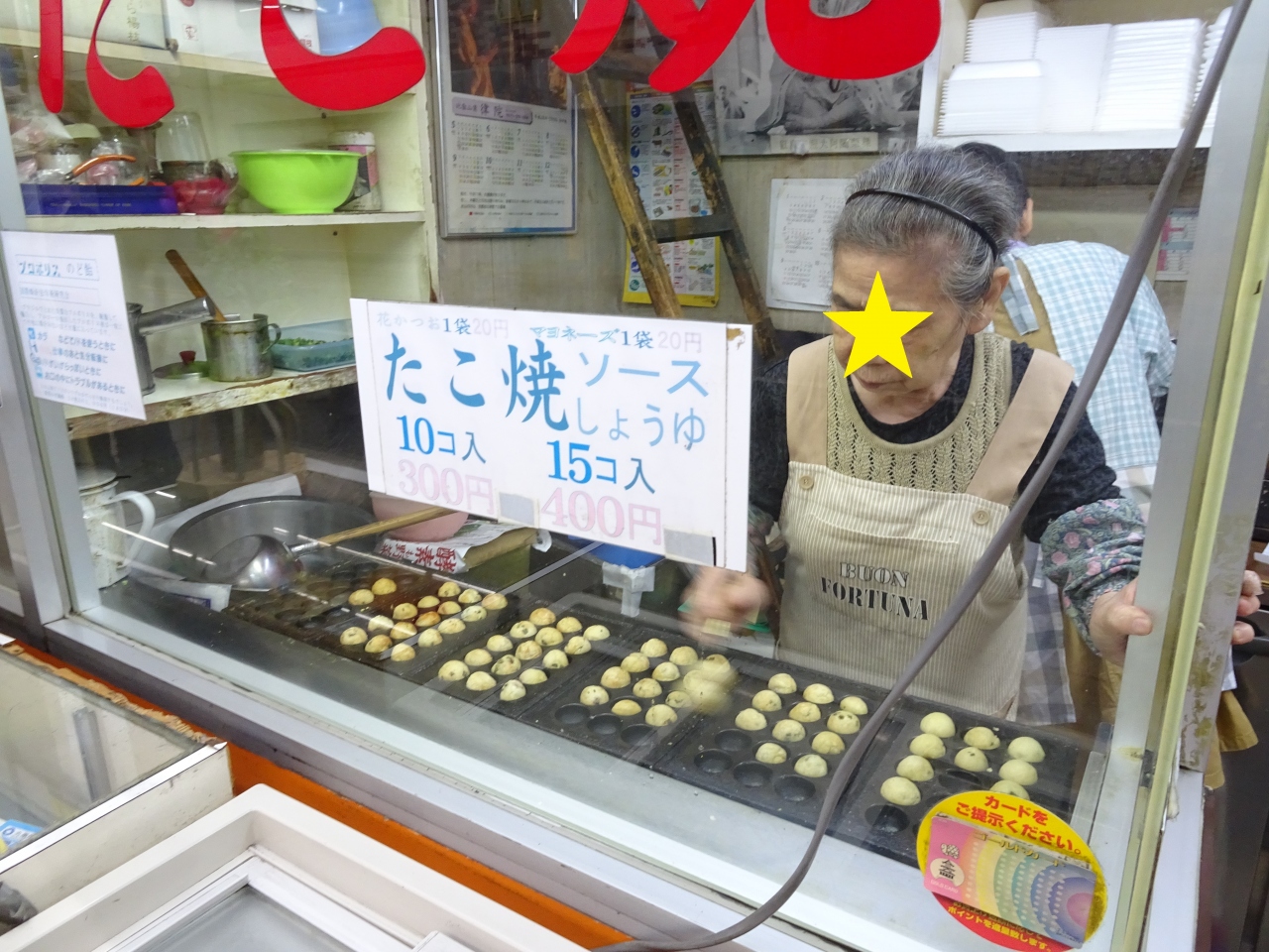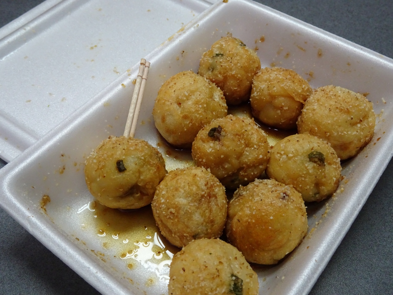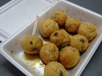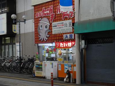 さてさて。部屋で頂きましょ。と…まん丸でちっちゃい。で、うーん。甘いゾ。なんというんでしょう、たこ焼き本体も甘めでしょうゆも甘辛な感じでビールのアテには無理な感じでした。具のたこもちっゃくて、お値段なりという感じ。個人的には無理でした。- 旅行時期