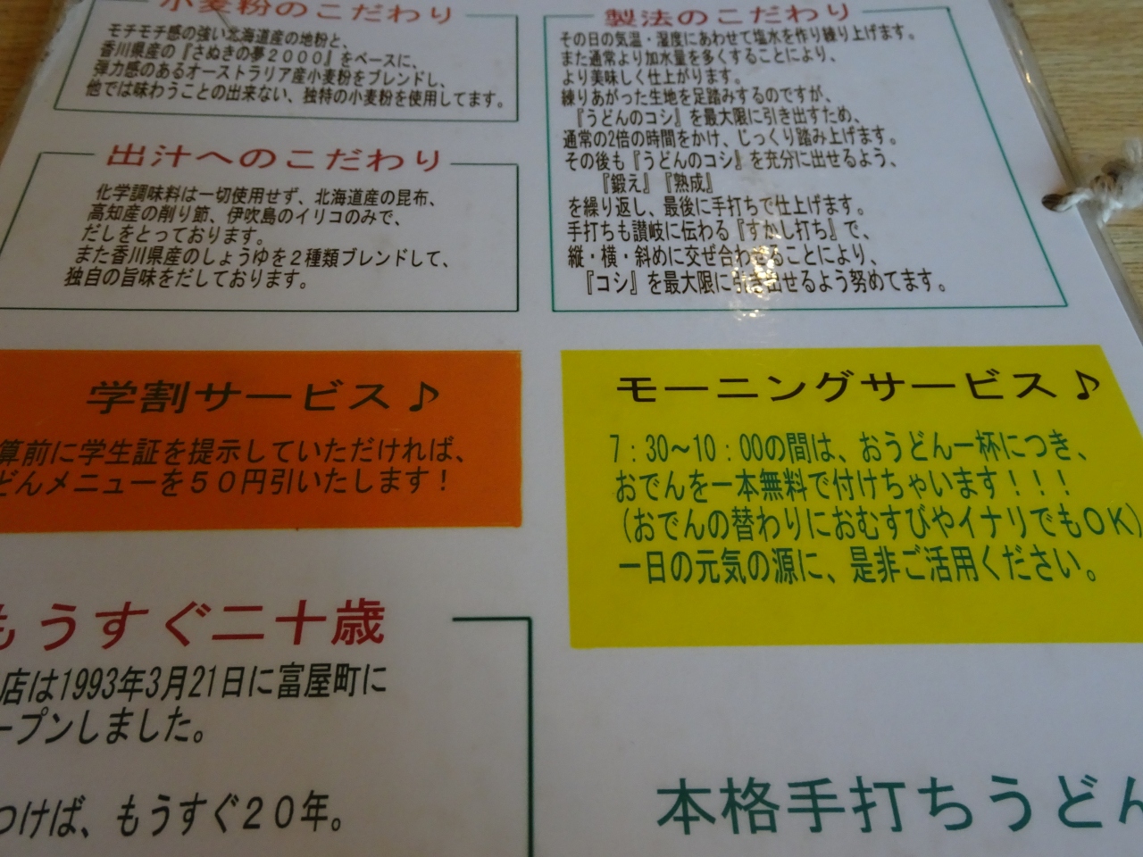 朝はおでん一本か、おにぎり一個がサービスでつきます。これは嬉しいサービスですね♪ぶっかけの汁は別添えでお好みで。天ぷらは受注生産のようで、あつあつが提供されます。うどんはマイルドでまろやか。いやいや、これだけの内容でこのお値段。ステキ過ぎじゃないですか。おばあさんの接客も素朴。厨房のお兄様の愛想もばっちしです。とっても美味しく気持ちの良い朝食を頂きました。- 旅行時期