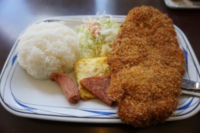 入口入ってすぐ左側の券売機で食券を買います。次から次へと入店されるお客さん。予め決めておかないと焦ること間違いなし。頂いたのはCランチ(570円)まず最初にスープが出てきます。ほどなくして、Cランチ様のご登場。写真の通り、お皿からはみ出したワラジカツがドッカーンと乗っかって、更にたっぷりのご飯、玉子焼きやソーセージ、サラダなどの重装備。いやぁ。沖縄の方々って…沢山食べるのね(驚)お隣の席の方の食べていた、オムライスの大きさもただただ目を見張るばかりでした。