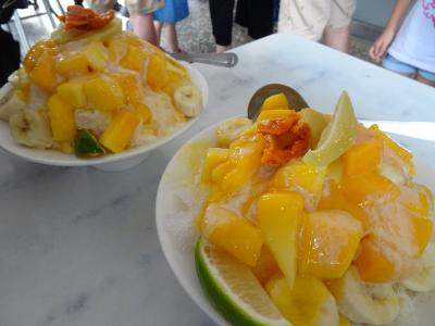 レジでおじいちゃんに、注文用紙を渡して頂いたのはマンゴーかき氷 160元。待つこと10分ほどでの提供でした。たっぷりのマンゴーとバナナなどが乗っかったデカ盛りのかき氷は、所謂台湾風サラサラな氷ではなく純粋な日本式、がりがりかき氷。一気に食べると、頭キンキンしちゃいますよ。フルーツの量も半端ないので、お腹にもくるかき氷。