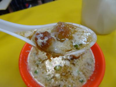 焼餅猪排起士蛋は、日本のお好み焼きに似てますね。お肉やチーズなどが入ってますが、案外あっさりしています。鹹豆漿は干大根や酸菜、油條、ネギなどが入っててお酢がきいているのが印象的で、身体によさげな逸品です。