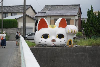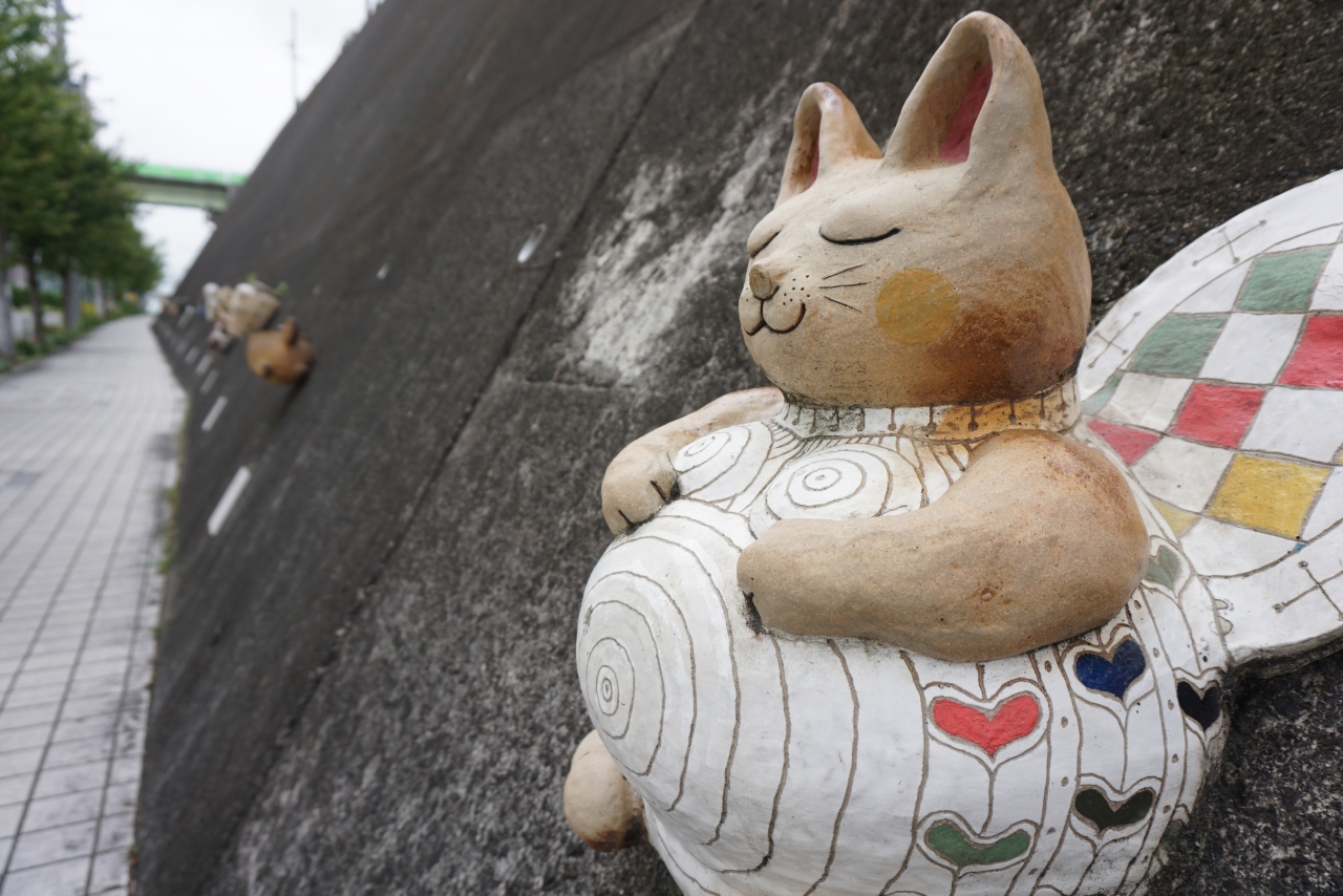 名鉄常滑駅から歩いて数分。常滑焼き物散歩に向かう途中、様々な焼き物の猫たちが楽しげな表情で待っていてくれます。一匹ずつじっくりと挨拶しながら先へ進むと散歩道Aコースのスタート地点。駅から見える巨大猫の「とこにゃん」は、この散歩道を少し歩くと間近に見えるスポットから見ることが出来ます。にしてもとこにゃん…巨大過ぎです。夜はライトアップされるようですね。