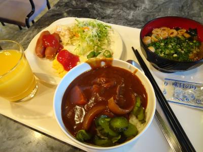 こちらのホテルの自慢は、カレー。久しぶりに朝カレーしちゃいました。カレーはコクがあって、そこそこ美味。野菜サラダもあるし、味噌汁、納豆、海苔などの日本の朝食の定番もあるし、もちろんパンやフルーツも。決して豪華ではないけど、十分な内容です。