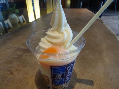 下呂温泉神社のすぐお隣さんです。今まで何度も下呂に来ているのに、お店の存在さえ認識していなかったかも。店内で注文したのは、もちろん温玉ソフト 410円。なななんと、温泉玉子inソフトクリーム。初めてお見受けしたその凛々しいお姿に一瞬凍りつきました。へ~。発想がめっちゃ面白いワ~。