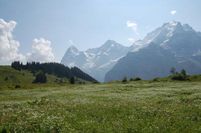 ケーブルカーの終点にはレストランがあり、私はバーべキューランチを食べました。360度の山々とお花畑広がるハイキングコースはおすすめです。色とりどりの花は本当にきれいでした。途中牛がのんびりと草を食べていたり、山小屋があったり、最後はミューレンの街中を通ってケーブルカー乗り場へと降ります。ミューレンの町はとても静かでかわいい町です。断崖絶壁の上に立っているので遠くから見ると町全体が落っこちるんじゃないかと、地震王国の日本人は心配になりますが、スイスは地震、水害などの被害は本当に全くないそうです。
