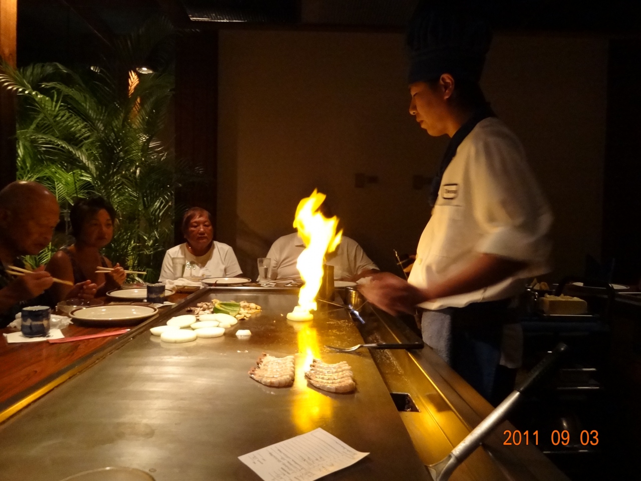 ツアーの特典でついていたのでディナーで利用しました。全く期待せずに行ったのですが、味もパフォーマンスもとてもよかったです。少食で普段ほとんど何も食べない子供が、派手なパフォーマンスに釣られて、今まで見たことのない量のえびやステーキを食べていました。