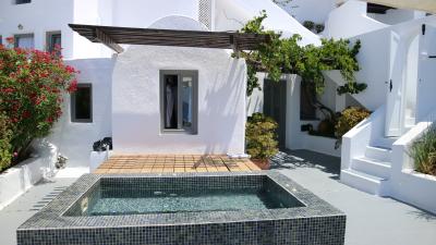 部屋はとても広く、設備も充実しておりミストサウナやバスタブも付いています。朝食は自室のテラス席からイアの街とサントリーニ島の美しいカルデラを眺めながら摂ることが出来ます。- 旅行時期
