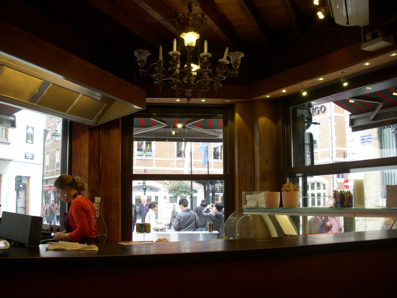 2011年のフランスの『マダム・フィガロ』誌でブリュッセルのベストワッフル屋さんに選ばれています。 1階ではテイクアウト用を焼いていて、店内の立席テーブルや外で食べることも。