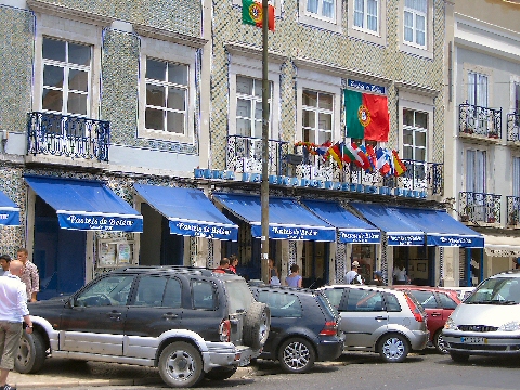 まぁ、あまりにも有名なエッグタルトの店ですね。ジェロニモス修道院のレシピを使っているそうだ。酒飲みのぼくには、やや甘いけれど、うまかった。店のシステムは、カウンターだと安くて、テーブル席だとやや高いというバル方式。でも、甘いものなんで、エスプレッソとあわせて食べると、おやつには最高でしょう。ジェロニモス修道院で疲れた身体をいやせばいいでしょう。お店はこんな外観で、青が目印、すぐに見つかります。