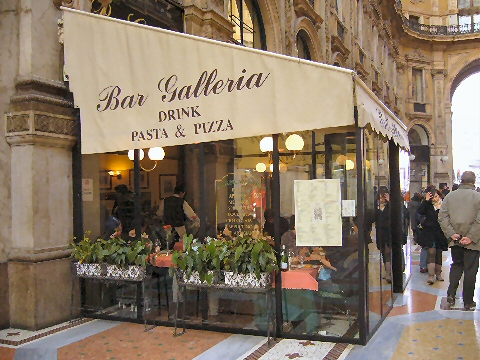 ミラノ大聖堂とスカラ座を結ぶガレリアのなかにあるBar Galleria 。店頭には「日本語メニューあり、手打ちパスタが自慢」みたいなことが書いてあって、他の店を探すのが面倒だったので入ったけれど、正直なとこ失敗だった。値段はやたら高いし、どう考えても手打ちとは思えないパスタ。席も狭いし、店員もなんか日本人を馬鹿にしている感じ。いいカモになっているんだろうなということを実感した。こういう場所の店は期待しちゃいけないんだろうけれど、それにしても大外れ。