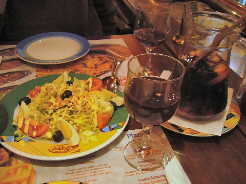 メニューはごくふつうのスペイン料理にちょいとアメリカンな感覚を交えた感じのもの。パエーリャやパスタはうまいし、サングリアもいろんなフルーツが入っていて美味。そして、他の店にはない焼きうどん風パスタ、こいつが変わっているのだけれど、なかなかいける。