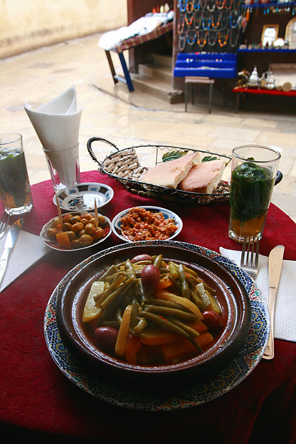 モロッコ料理といえば、クスクスかタジンとなるのだけれど、どちらも「素朴な味」みたいな書き方が多い。で、食べてみると、要はあんまりうまくないということのようだ。味が薄いというか、味がないというか、かなり物足りない。これはどこの店で食っても一緒のようだ。ならば、メディナのかなり目立つところにあるこの店を勧めておこう。店の名前がよく分からないのだけれど、ブー・ジュルード門を入って、タラア・セキーヤ通りとイスティクラル広場へ抜ける道が分岐するところにある。フェズでは英語メニューがあるということも重要かも。