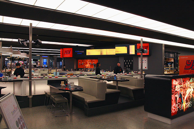 ユーロスターの新しい発着駅になったセント・パンクラスは、ようやく工事もひと段落したようで、レストランなども充実してきた。そのなかで目についたのが回転ずし。なんだかなぁと思いつつ、食に関してはかなりレベルが低いロンドンだから、メシ物が食えるのは、いいかも。
