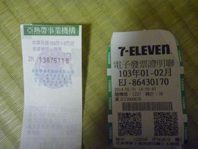 台湾で、買い物するとレシートが渡されます。それには、8ケタの数字が書いてあり、それが宝くじの番号です。2か月に一度、抽選があり、特賞は、なんと1000万元です。特賞の番号1つの8ケタの数字全てが当たると当選です。末賞は200元。1等の当選番号3つの8ケタの数字の下3桁と、別に2つの3桁の数字のうちどれかが当たると当選です。高い賞金は、指定された郵便局、低い賞金は、すべての郵便局で、パスポートと当選したレシートに、必要事項を記入して持っていくともらえるそうです。
