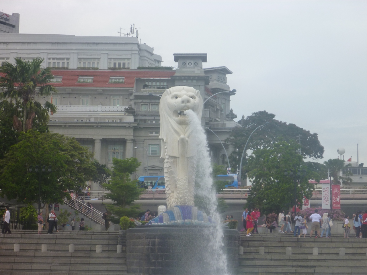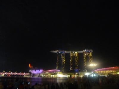 マーライオン公園から鑑賞した。音楽とともに光噴水が出るらしいが、マーライオン公園からは光と噴水のみで音楽が聞こえず、光も噴水もちょっと期待外れ。人は多く光に照らされたマーライオンもきれいだが、1度体験すれば十分。