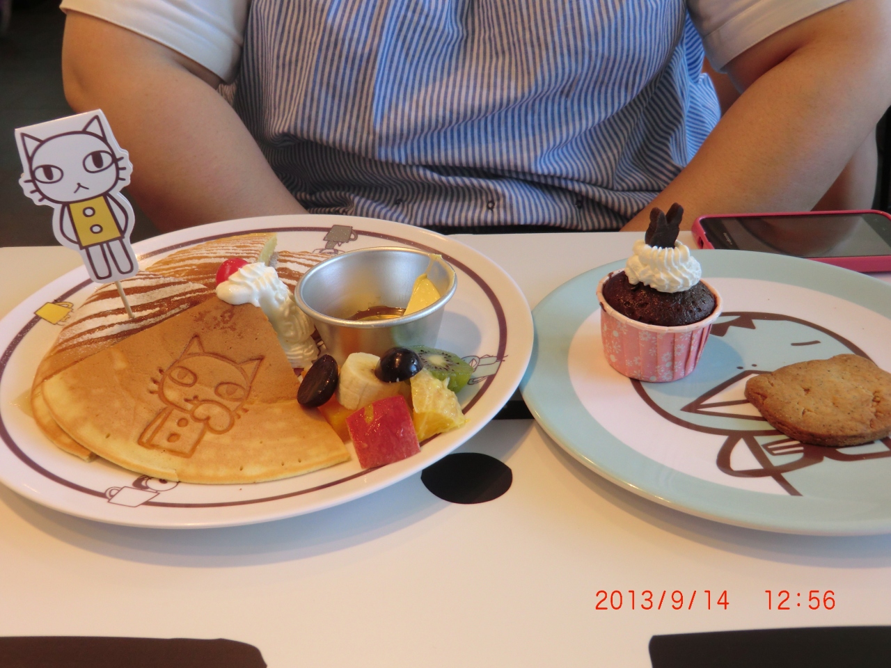 朝食バイキングをお腹いっぱい食べていたので、あまりお腹の空いていなかった私たちは、「猫大好きハニー・ホットケーキ」NT$100にプラスNT$130で、