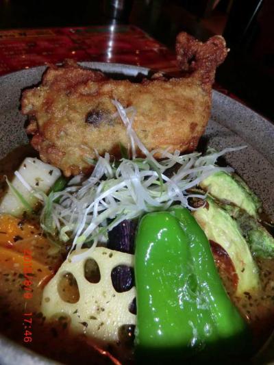 スープカレーといえば、鶏肉なのですが、ここにはフライドチキンをトッピングしたものや、豚の角煮入りなど、様々な肉のバリエーションがあって、それも良かった。