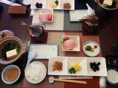 着くと黒豆茶のウェルカムドリンクとお菓子を頂き、食事の前にのんびりと温泉につかり、夕食は「石窯ダイニングはなり」でいただきました。