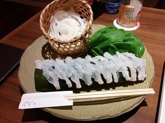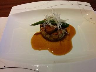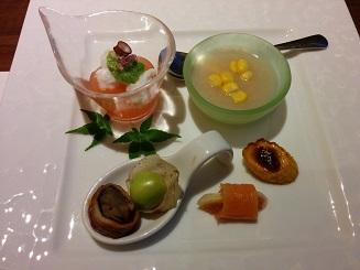 夕食はフランス料理のフルコースでした。前菜、スープ、魚料理は伊勢エビ、肉料理はポーク、デザートでした。追加料金でアップグレードで出来ましたが、十分美味しく頂きました。自家製のパンが美味しくて、特にあおさを練り込んだパンは秀逸。おかわりをしていただきました。