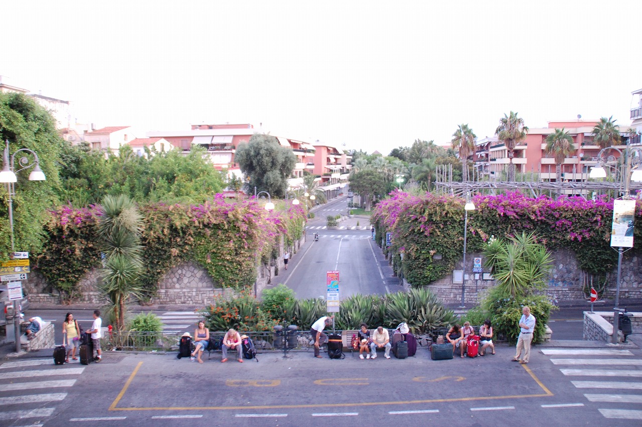 アマルフィへ行くバスにはソレント駅前のバス乗り場で乗車できます。バス停は駅を出て写真右側の階段を降り横断歩道を渡ったところです。街路灯の後ろの石壁に時刻表が見えます。