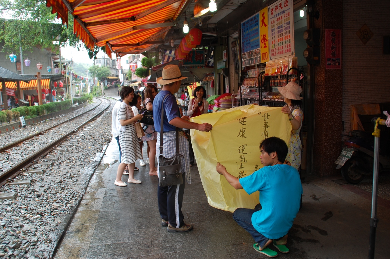 平渓線の十分駅。駅前の一軒にランタンに願いを書いて飛ばしてくれる店がありました。費用は100NT$。旅行の途中に是非立ち寄ってみてはいかがでしょうか。有名な観光地九分へのゲートウェイ瑞芳駅で平渓線に乗り換えすぐの駅です。