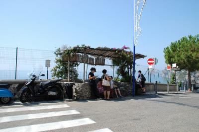 アマルフィ海岸のポジターノはぜひとも立ち寄りたい見所です。ソレント駅前からSITA社のアマルフィ行きのバスに乗り、ポジターノの海よりのバス停(写真)で降りてください。海岸線に沿って坂を10分ほど下り、浜に向かうとよく観光写真に見るポジターノの海岸に到着します。ソレントからアマルフィに向かう場合は是非進行方向右側の席に。絶景が見られます。