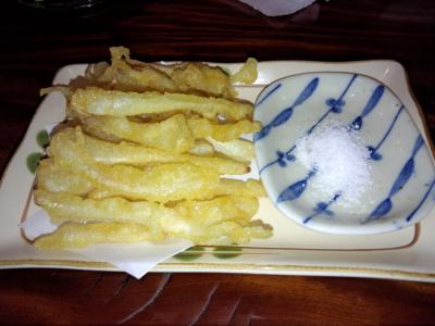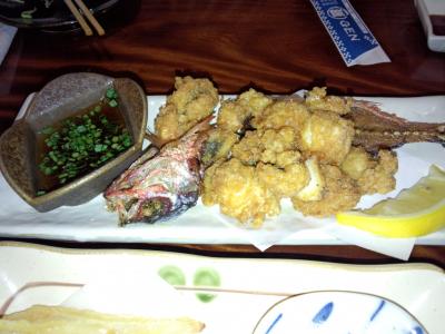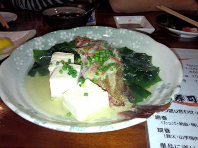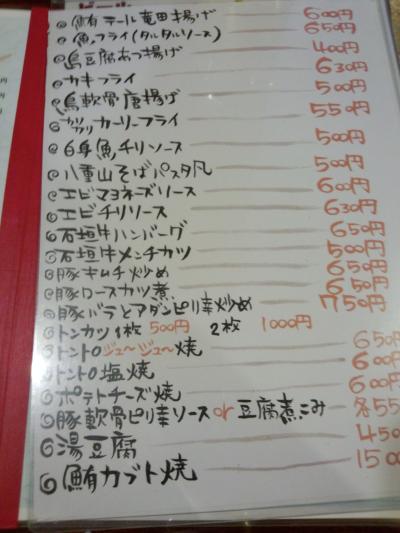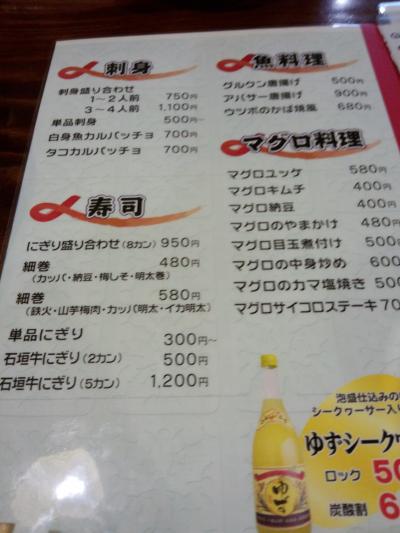 注文したお料理は、島とうがらし餃子、島らっきょう天ぷら(500円)、グルクン唐揚げ(500円)、にぎり盛り合わせ8カン(950円)、八重山そばパスタ風(500円)、きゅうりの一本漬け、マース煮、マグロサイコロステーキ、サラダ、揚げ出し豆腐、などなどいろいろ注文しました。