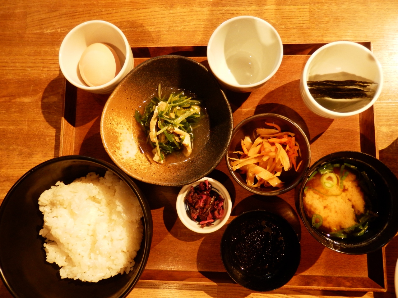 他のメニューが売り切れでしたので、薩摩赤玉のたまごかけご飯を注文しました。あと、単品メニューで京都らしいメニューがあったので、私は京水菜のさっと煮とコーヒーを注文しました。材料もこだわっているだけあって、シンプルなメニューでしたが、とても満足のいくものでした。とくに京水菜のさっと煮は京都らしくあっさりとした味付けで、煮汁が水菜の本来の味を引き立てているような感じがして注文してよかったなあと思う一品でした。他のメニューのおいしそうだったので、次回来るときは別のメニューを注文したいです。