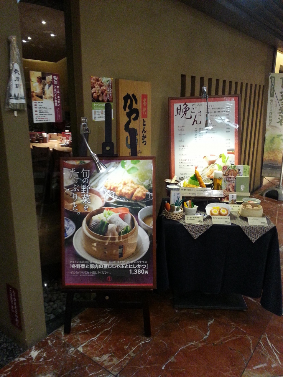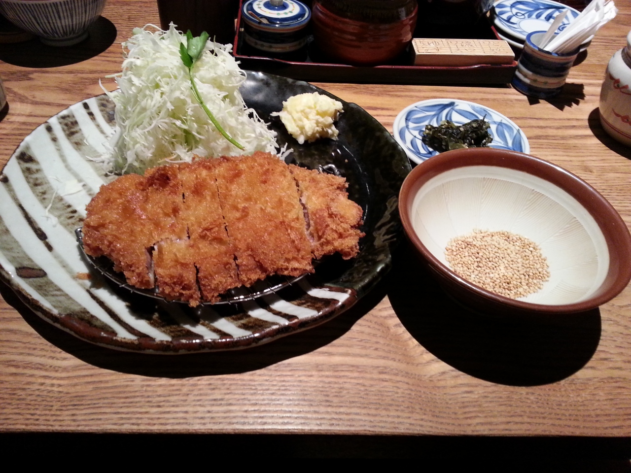 肝心な料理ですが、とんかつ120グラム590円、御膳セット(400円、これを頼むとご飯、みそ汁、キャベツがお代わり自由になります。)で千円以内に収まります。あと、別に京都らしい惣菜を頼むことができます。今回は注文しませんでしたが、次回は注文してみたいです。