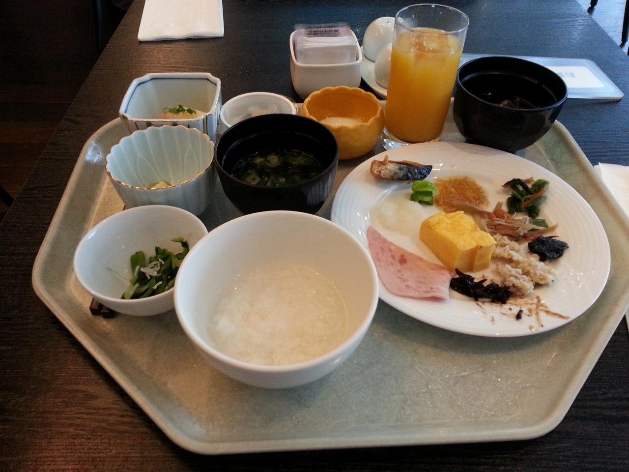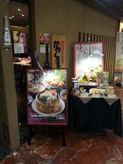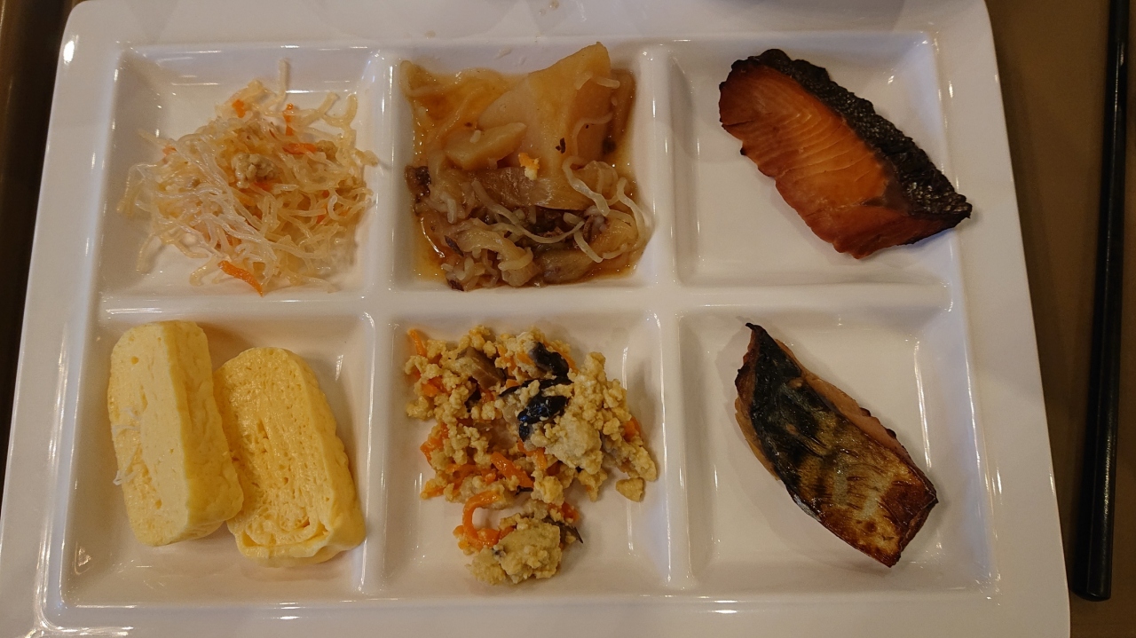 夕食はホテルに居酒屋が在るだけで、周りは地元の人が行くような通常の店ばかりでした。朝食はホテルの居酒屋のところが運営するもので、京風のおかずが3品ほど付いてきて、ご飯、みそ汁などはお代わり自由です。