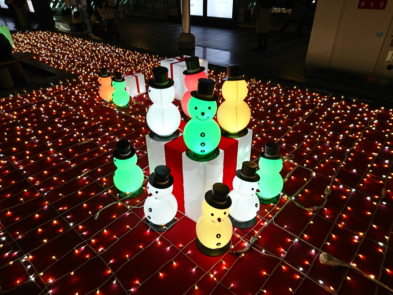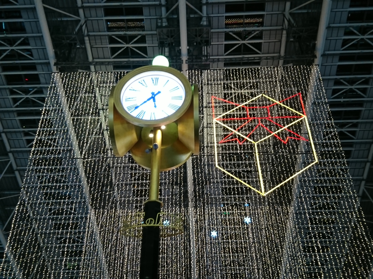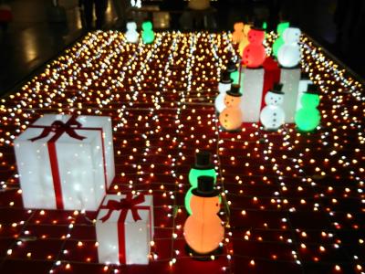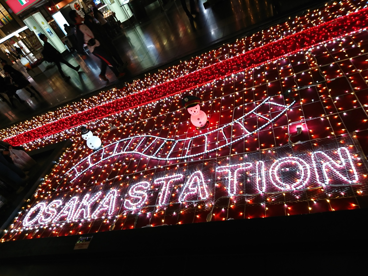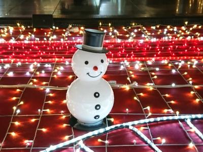 大阪駅の時空の広場は、時期によりいろんなイベントが行われていますが、毎年12月頃になると表題のTwilight Fantasyというイベントが行われます。夕方17:30以降に30分間隔で天井からぶら下げられたイルミネーションと地上の装飾部分が点灯されます。毎年スノーマンが飾られいるけど、今年は駅員さんバージョンです。あと、その近くに線路が光るのがきれいでした。