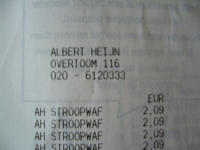 オランダのチェーン系スーパー Albert Heijn(アルバート・ハイン)で、水やプライベートブランドのお菓子(ストロープワーフェル他)を購入しました。