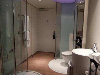 お部屋はかなりスタイリッシュというか、個性的で、中に入ると2つの円筒があり、トイレ、シャワーでした。(磨りガラスで、友人同士など少し恥ずかしいかもしれません)