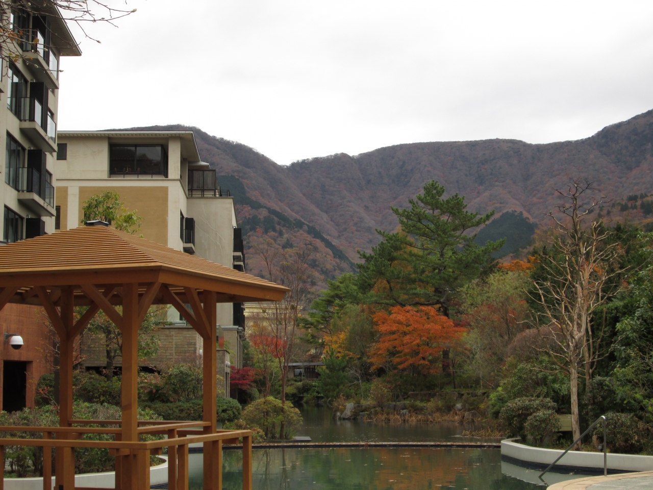 箱根登山鉄道強羅駅には東急箱根リゾートのシャトルバスが迎えに来ており、秋の山中の紅葉を車窓越しに楽しみながら林道を進み、約15分ほどで仙石原温泉のホテルハーヴェスト箱根甲子園に着いた。礼儀正しく親切なフロントで荷物を預かっていただき、近くの湿性花園周辺を散歩後、ラウンジでの黒豆茶は暖まった。宿泊客は上品な方ばかりであり安心してくつろぐことが出来て、すっかりと紅葉した水辺の中庭を眺め、秋景色を落ち着いて楽しんだ。チェックイン後、最上階の風呂にのんびりつかり、箱根内輪山の眺望を眺めながらの露天風呂は至福のひととき。マッサージチェアのある湯上りラウンジからの眺めも素晴らしく、深まりゆく秋色の箱根の風景は日本の原景色と思われ穏やかな情緒を感じた。翌日は中庭に設けられた足湯につかり、近くのガラスの森美術館などを散策、夕方最終のシャトルバスで強羅駅まで送って頂いた。かくして2日間の上質なリゾートは、最後までスタッフのホスピタリティに支えられ、楽しい想い出となった。